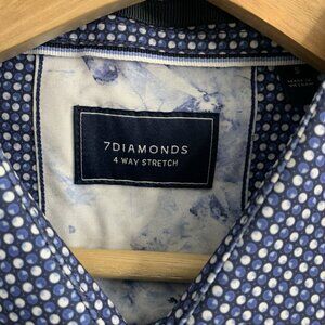 The 7 Diamonds Shirt for men in size small features a blue deep water color with a geometric pattern. Made from a blend of polyester and spandex, this button-up shirt offers a 4-way stretch for added comfort and flexibility.