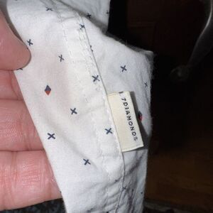 The 7 Diamonds Vision Quest Shirt is a stylish men's short sleeve button-up shirt featuring a geometric pattern with a button-down collar. Made from cotton, this lightweight shirt is perfect for various occasions including travel, parties, casual wear, work, and business meetings. The shirt is in size 2XL with a chest size of 44 inches, and is machine washable for easy care. The white color and logo accents add a touch of designer flair, making it a versatile piece for any wardrobe.
