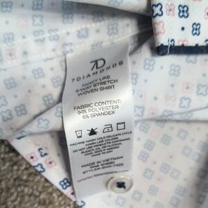 Casual button-down shirt with a white base and blue pattern. Ideal for everyday wear.