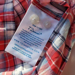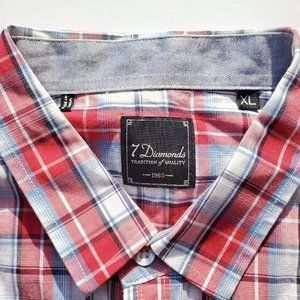 7 Diamonds XL (Red, White, Blue) Plaid Long Sleeve Button Down Made of 100% Cotton. Pockets on Both Sides of Chest.