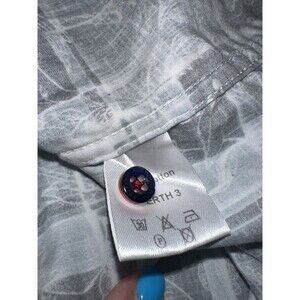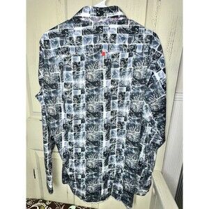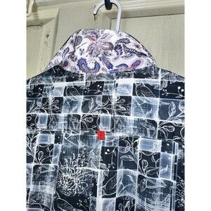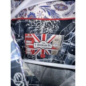 The 7 Downie St Couture Long Sleeve Flip Cuff Dress Shirt in Men's Size 5 features a blue abstract floral pattern, perfect for various occasions including parties, casual outings, and business events. Made from breathable cotton fabric, this button-up shirt with a spread collar and regular fit is machine washable for easy care. Designed for all seasons, this stylish and versatile shirt is a must-have addition to any man's wardrobe.