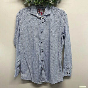 7 Downie St. Long Sleeve Contemporary Fit Button Up Sport Shirts in size M (7 Downie St.4) Excellent preowned condition. White with pattern in shades of blue squares, spread collar with fused stays, convertible French cuff, contrasting floral pattern on inside of cuffs, collar and button placket, darted in back to create semi tapered fit. Please see photos for approximate measurements and details. Item may show difference in color based upon photography and perception. Photos are part of the description, as everyone’s level of condition may vary. From smoke free and pet free home. All packages are shipped the same or next business day.