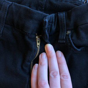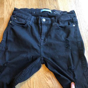7 For All Mankind The Ankle Skinny jeans. Stock photo provided for fit and style reference. Solid black with factory rips/distressing. Size 26. Kind of a softer lining on the inside! A little bit of stretching below the zipper area but not too bad! 45% cotton, 22% lyocell, 21% polyester, 10% rayon, 2% spandex. Tons of life left! Ask any questions :) Bundle with other items for the best deal!