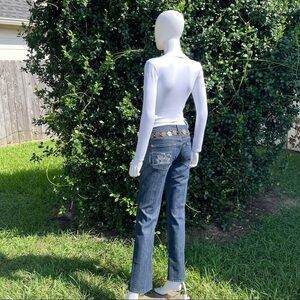 These jeans have been hemmed per the previous owner and had embroidery added to the back pocket and a number seven on the side of the leg. The alterations were done very well. Measurements are with the alterations