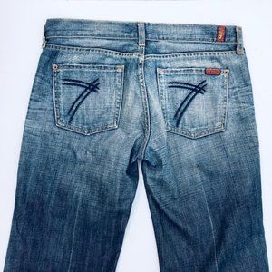 Mid-rise crop denim pants. Full leg with clean hemline. Back pockets have signature 7 embroidery. 5 pocket style with button and zipper closure.