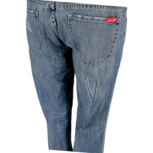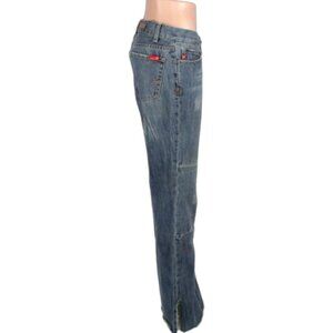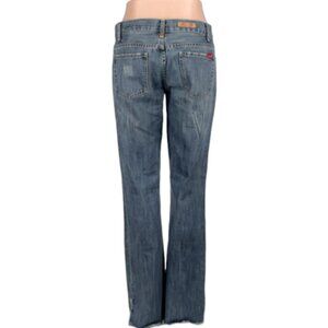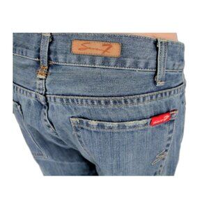 Blue 7 for all Mankind distressed jeans has tonal and contrasting stitch patterns on leg, raw edge trim, slit on side leg, button and front zip, belt loops, 3 pockets on front, 2 pocket on back.