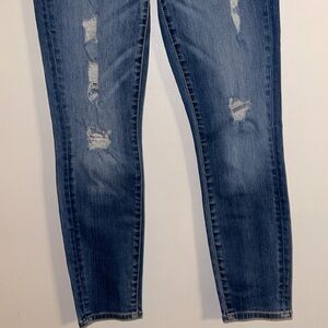 Stylish distressed blue jeans perfect for any casual outing. Comfortable fit with a trendy look.