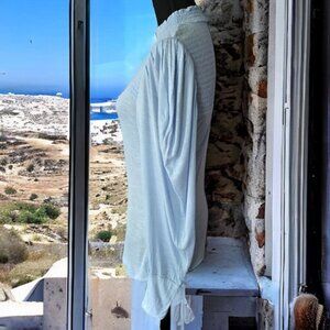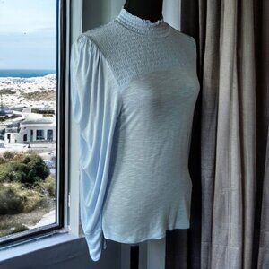 A light blue stretchy soft pullover blouse with pleated balloon sleeves with elastic detail on upper chest and collar.