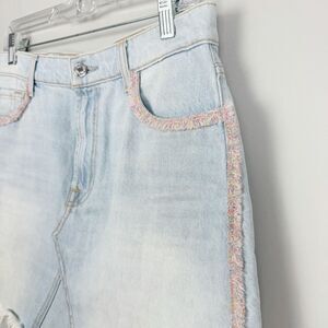 Super cute light wash denim jeans skirt by 7FAM. High waisted. Pockets and belt loops. Fun light pink and rainbow fringe trim. Raw edge hem. Zipper and button fly. Great condition! Women’s size 29.