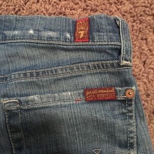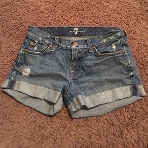 Jean shorts, Light wash, no stains, distressed portion on front left pocket not connected or tore open but doesn't look bad, cuffs sewn up