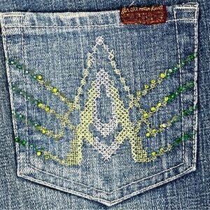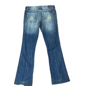 7 For All Mankind A-Pocket Blue, Light Wash, Boot Cut, 5-pockets with Green and white rhinestone “A”