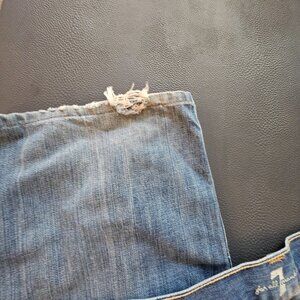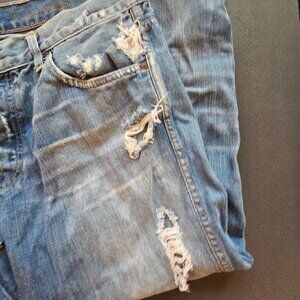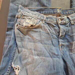 7 for all Mankind A Pocket distressed jeans. Light colored jeans, distressing and wear all over, A Pocket design on back.