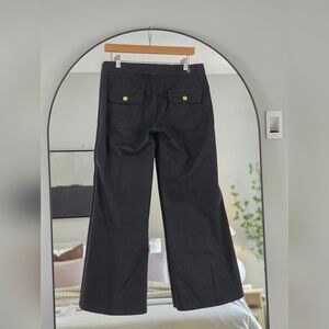 7 For all Mankind Black Denim Wide leg Jeans. Features a mid-rise waist and wide-leg sihouette. Designed with gold-tone button accents, zippered front pockets, and flap back pockets, they offer a mix of utility and modern sophistication.
