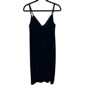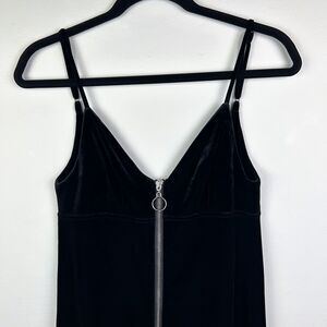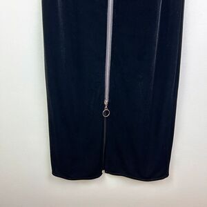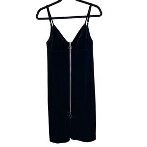 7 for All Mankind Black Velvet Midi Sheath Dress with silver front zip detail. This trendy fitted bodycon dress silhouette offers an edgy, modern update on the little black dress. Made of a luxe stretch velvet with full zip front and decorative O-ring zipper pull detail. Allows you to zip to choose how low cut you want the v neckline and bottom front slit to be! Sleeveless with adjustable spaghetti straps. Perfect for date night or a formal event where you want to look a little sexy! Women's size XS extra small, measurements pictured. Excellent used condition, originally sold at Revolve.