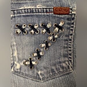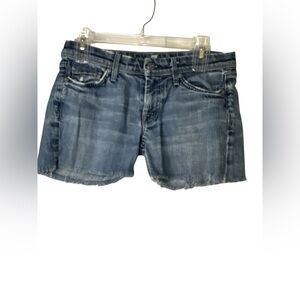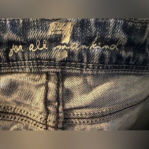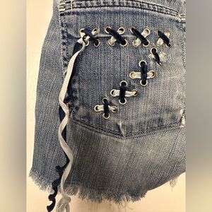 7 For All Mankind Blue Jean Shorts Distressed 7 Lace Detail on Pockets. Size 27. Left pockets lace has untied some.