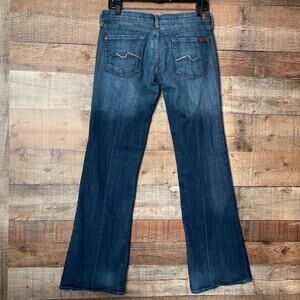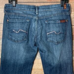 7 For All Mankind Bootcut Jeans. Style# U075055U. Cut# 704481. Size 30. Color ~ Blue. Pink Swarovski Crystals on the back pockets, a few are missing. Excellent condition. Measurements are in the pictures.