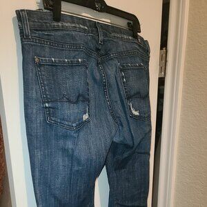 7 For All Mankind Bootcut Jeans. Blue denim jeans, distressed, button zipper fly.