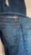 Fitted bootcut jeans with pink crystals on the back pockets make these denim pants stand out! Low cut, medium to dark wash blue jeans with lightly faded sections on front legs. Like new!
