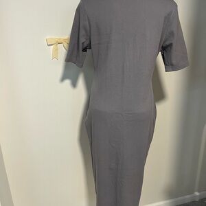 Chic charcoal midi dress with button-down front. Ideal for versatile styling.