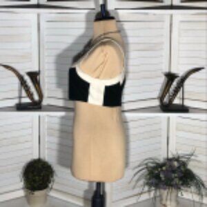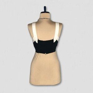 This 7 For All Mankind cropped top features a black and white color block design and a square neckline. Made from a breathable linen-rayon blend, it is fully lined with a back zipper and smocked elastic panel. A Y2K-inspired piece.