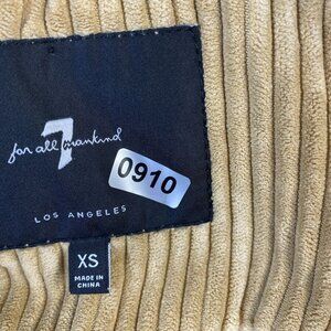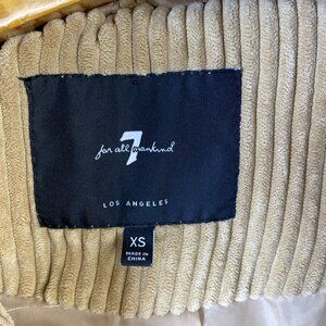 This is a trendy 7 For All Mankind puffer jacket in beige, made of corduroy fabric with polyester lining and insulation. It is a short-length jacket with long sleeves, featuring a zip closure and a solid pattern. The size is XS and it's designed for women.