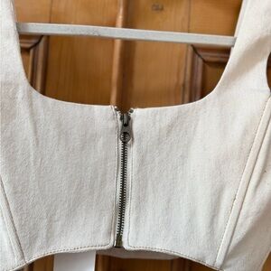 cream tank top with a square neckline. Features a stylish zip back. Perfect for layering or wearing alone.denim like stiffer material can me dressed up
