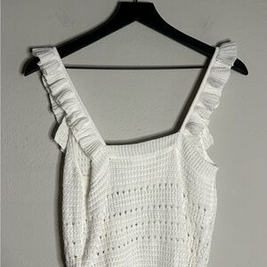 Crochet tank top with ruffle strap detail from 7 For All Mankind. Ecru (off white). Scoopneck. Pullover style. 100% cotton. Size XS. See photos for measurements. New with tags.