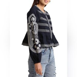 The embroidery runs from the elbow down the sleeve and edges finishing with an eye-catching flounce hem.
