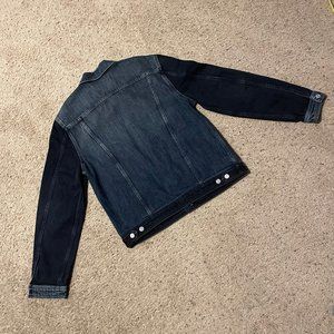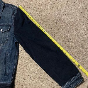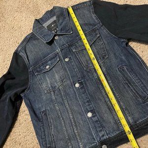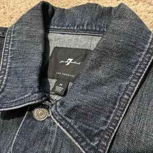 A 7 For All Mankind denim trucker jacket, size medium. Features unique contrasting sleeves and silver hardware accents. It's a very heavy denim, best for cold weather for sure. In great pre-owned condition - I take care of my clothes - and has never been tumble dried. Measurements are pictured.