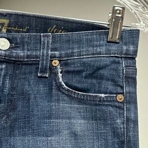 7 For All Mankind “Dojo” cropped low waist jeans. Classic 5-pocket style with belt loops and button closure. Zip fly, distressed seaming at pockets, 7FAM logo on back pocket and at back waist. Women’s Size 25.