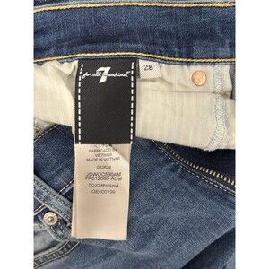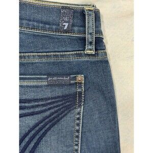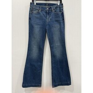 LIKE NEW: The product is a pair of 7 For All Mankind Dojo Denim Jeans in size 32 with a wide-leg flare style, perfect for a Western cowgirl look. These jeans are designed for women and feature pockets for added convenience. The denim fabric in a classic blue color adds a timeless touch to this trendy and versatile piece of clothing.