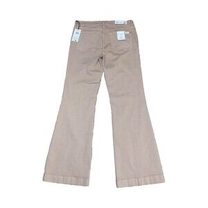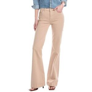 The 7 For All Mankind Dojo Flare Leg Trouser in size 32, Sandcastle Khaki Tan, offers a stylish and versatile addition to any woman's wardrobe. These high-rise jeans feature a zip and button closure, a flattering 5-pocket design, and a comfortable stretch denim fabric. The flared leg style and slimming fit make them perfect for all seasons, while the solid color and logo accents add a touch of sophistication. The khaki tan shade offers a neutral and trendy option for everyday wear, whether for a casual day out or a night on the town. MSRP $238