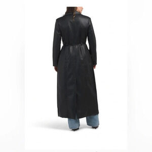 faux leather design, pebbled finish, 2 front pockets, fully lined, back vent, shoulder pads, detachable belt hits at ankle