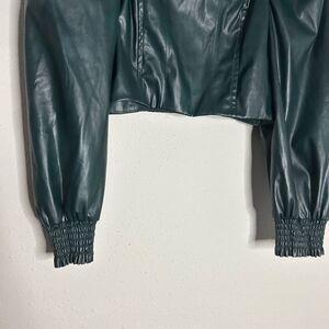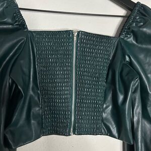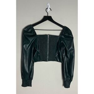 Green vegan leather crop top from 7 For All Mankind. Long puff sleeves. Stretchy smocked back with zipper. Size S. See photos for measurements. Good preowned condition with no tears or stains.