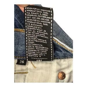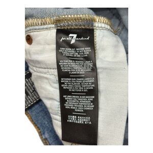 The product is a pair of 7 For All Mankind High Waist Ankle Gwenevere Skinny Jeans in size 28. These jeans feature a side stripe pattern, zip and button closure, and come in a classic blue color. They are designed for women with a regular size and are part of the 7 For All Mankind brand's collection. The skinny style and ankle length make them versatile for all seasons, perfect for any casual or dressed-up outfit. With pockets included, these jeans offer both style and functionality for the modern woman.