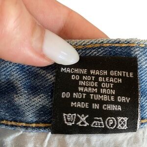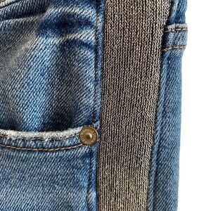 Features a high rise, medium blue wash, skinny-leg silhouette, ankle length, five-pocket style, contrast metallic stripes at side seams, contrast stitching, brass-tone logo hardware, fading and whiskering throughout, soft cotton stretch fabric, frayed edges at front pockets, zip fly and button closure. Great preowned condition, no notable flaws.
