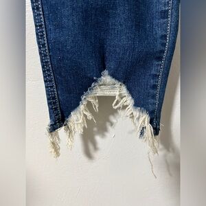 • Hem: Raw, asymmetrical frayed hem with distressed edges