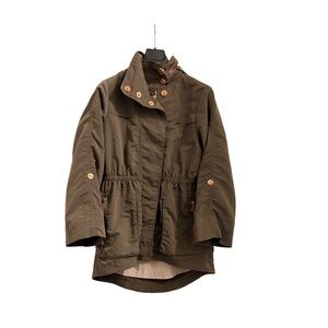 Snap closure, zip closure, hood concealed with zipper pocket at neckline.