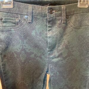Jean is coated for a shiny finish. 5 pocket, zip fly w/top button, Cropped skinny leg, Cotton/lyocell/polyester/rayon/spandex. Worn once for a party. Smoke Free Home
