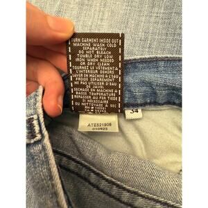 These 7 For All Mankind men’s jeans in size 34 feature a relaxed fit through the thigh and a straight leg. Made in the USA from 100% cotton denim, they offer a durable, laid-back look with a faded light wash and raw, frayed hems for that perfectly lived-in aesthetic. Great for casual wear and styled for comfort with a modern vintage vibe.