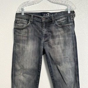 7 For All Mankind Jeans Mens Size 34 A Pocket Boot Pants 100% Cotton Blue Denim. Some areas distressed as shown in pictures. Measurements in photos is from seam to seam in the waist and bottom of crotch to bottom of length.. Please compare measurements to clothing you already own before ordering. Jeans have been laundered but always suggest washing any pre owned garments.. please look at all photos and feel free to contact me with any questions..