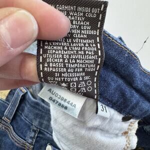 Light wear with factory distressing present. Small intentional abrasions/tears near the front pocket areas and mild fade at thighs/knees as shown. No stains or holes beyond the intentional distressing. Hems and seams intact. Button and zipper function properly.
