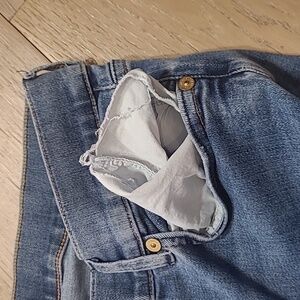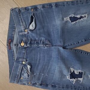 pre-loved, gently worn, good condition. Cotton/elastomultiester/elastane blend, button closure, 5 pocket designs, distressed legs with inserts, mid rise, stretch, Midnigh Blue color
