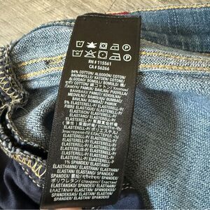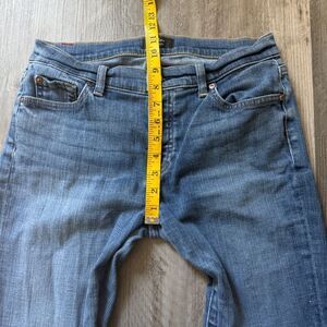 7FAM Josefina mid rise jeans with button fly closure. Very comfortable with soft stretch and that perfectly worn-in feel. Waist size 28. Please see photo section for approximate flat measurements + my model stats for fit reference. Material: 94% cotton, 5% elasterell, 1% spandex.