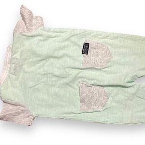Green baby boy coverall/jumpsuit. This piece has snap button closures and small pockets. Good overall condition. No rips or stains. Minimal signs of wear from being washed and worn.