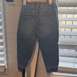 Stylish blue jeans with elastic waistband. Features drawstring and side pockets.