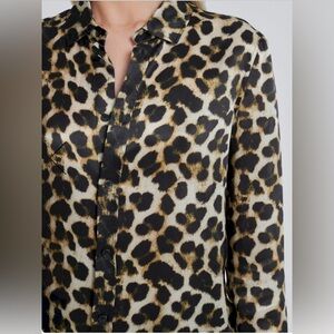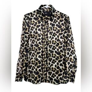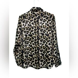 Stylish leopard print blouse. Button-up front. Long sleeves. Perfect for casual or dressy occasions.