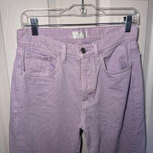 Lilac colored "easy straight ankle" style jeans from 7 for all mankind. Button fly closure. Front and back pockets. Frayed hem. High-rise.