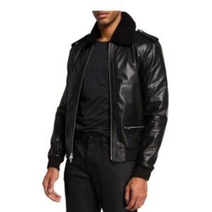 7 For All Mankind Men's Lamb Leather Black Jacket Shearling Fur Collar Bomber Moto Biker Coat