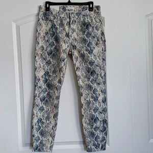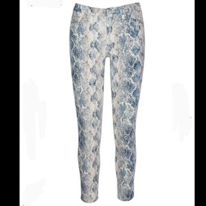 'Gwenevere' Mid-rise ankle length skinny jeans silhouette. 5-pocket style. Zip fly with button closure. Denim fabric with a touch of stretch. All-over snakeskin print.